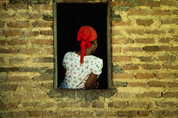 Brick Wall, Woman's Back in Window