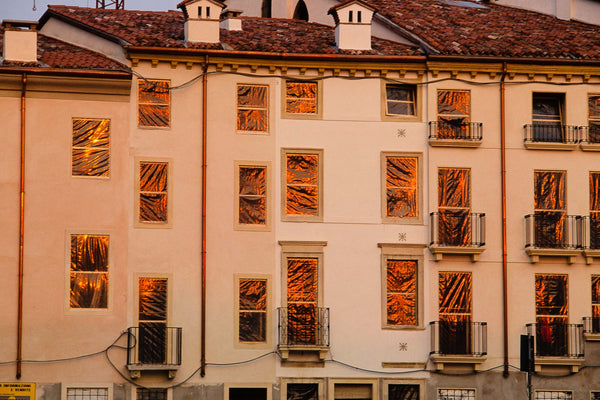 Building with Plastic on Windows Reflecting Sunset, Vicenza