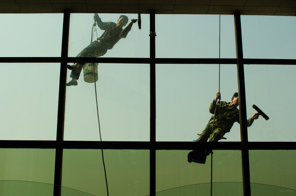 Two Men Cleaning Windows at Airport, Beijing